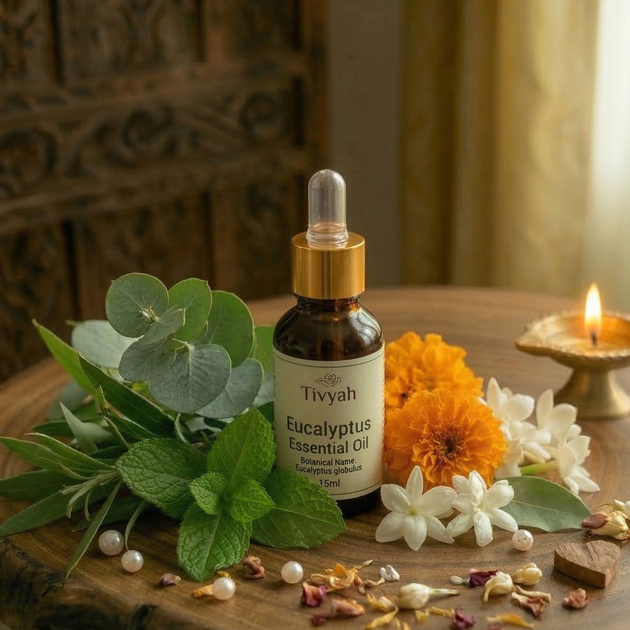 Benefits (as per studies & traditional use): As per traditional use and studies, eucalyptus essential oil is often associated with a refreshing aromatic experience and a sense of clarity when diffused. It has also been traditionally included in wellness and household routines, where its naturally occurring aromatic compounds are valued for their clean and invigorating scent.